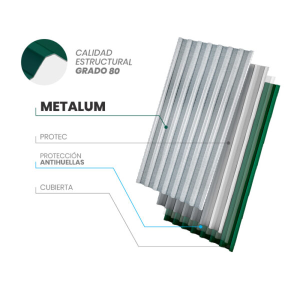 Está cubierta presenta una geometría con crestas y valles reforzados lo que le da una capacidad de carga superior a la de la mayoría de las cubiertas del mercado. Al tener crestas reforzadas permite utilizar tornillos fijadores en la cresta. Medida 1x6Mts. Espesor 0,36mm. Material: Acero galvanizado.