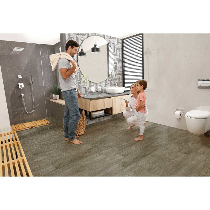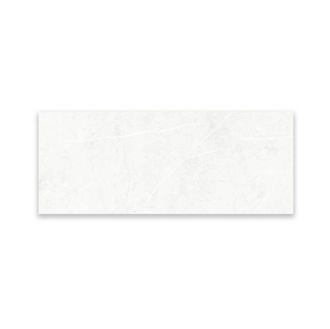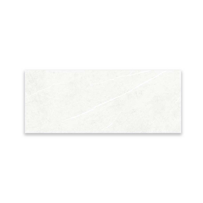 Pared blanca brillante de vetas que atraviesan el revestimiento en forma diagonal, formato de 30,1×75,3 posee caras diferenciadas, ideal para baños y cocinas.