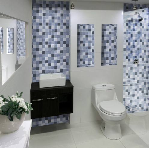 Revestimiento simulando una malla cerámica en formato de 31,5×31,5, con ventaja de instalación por ser una sola pieza, para uso en baños y cocinas con un acabado microgranillado que genera sutiles destellos.